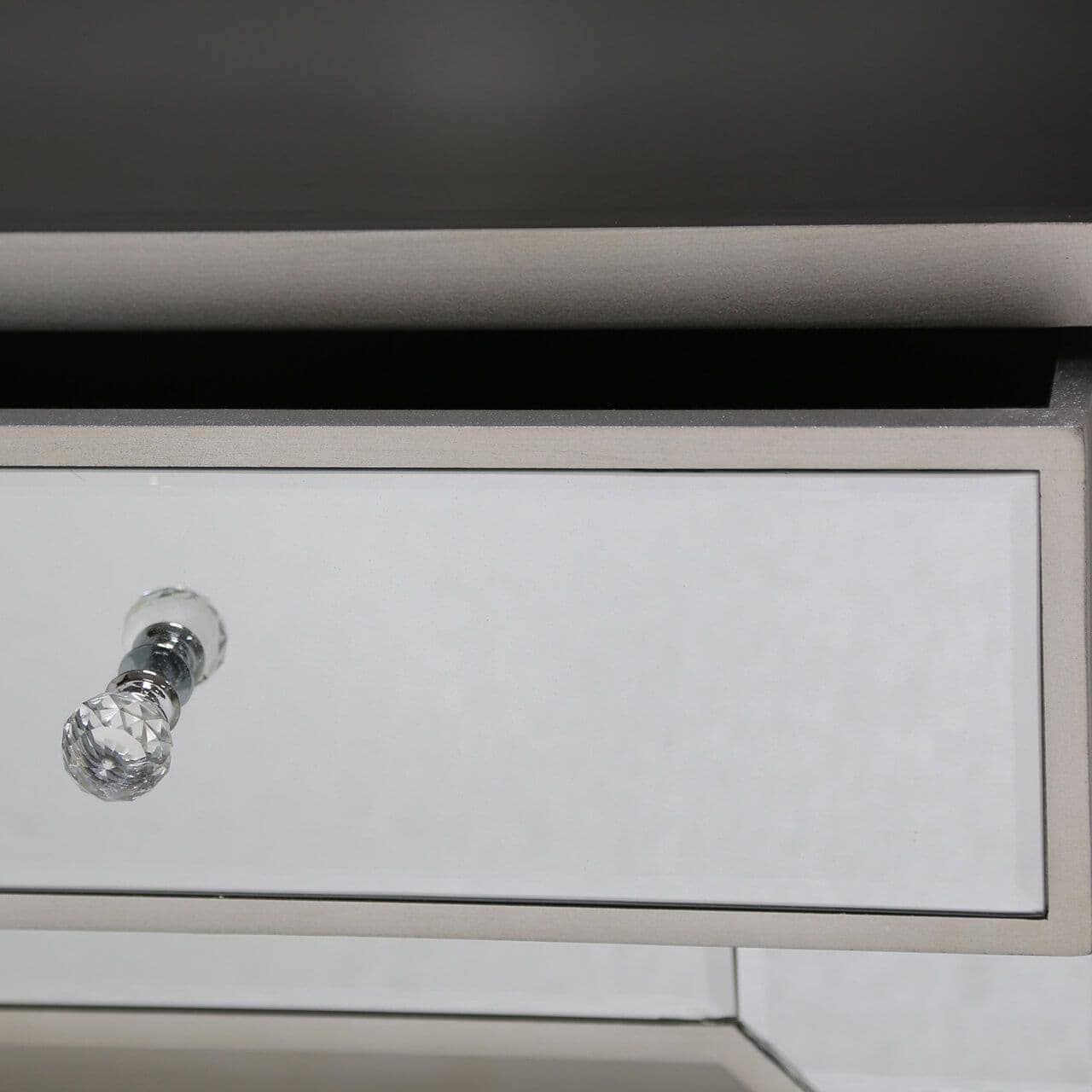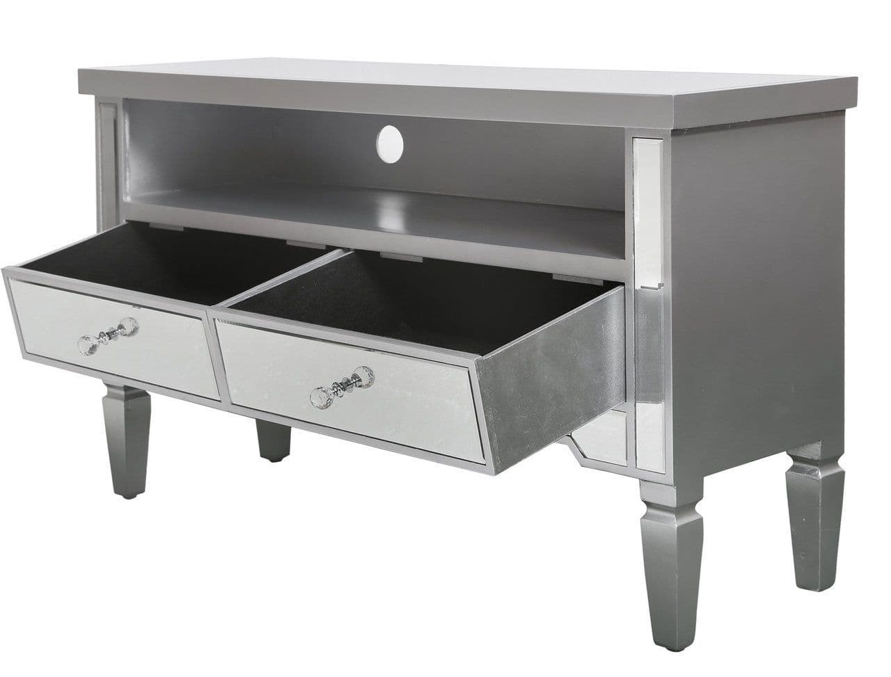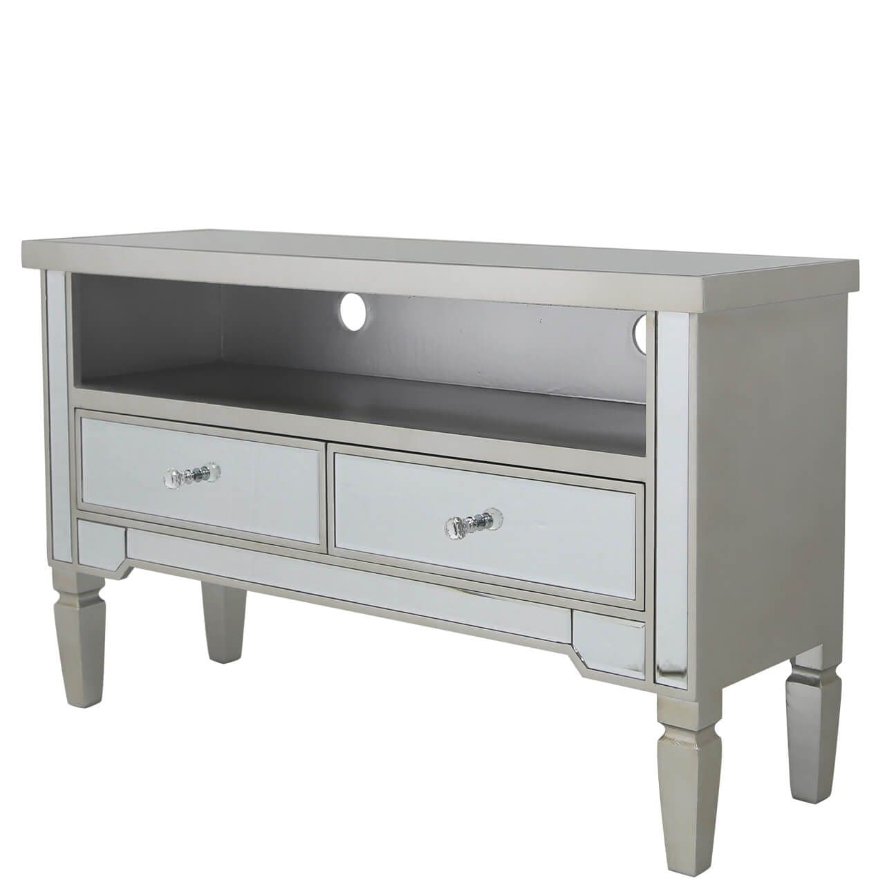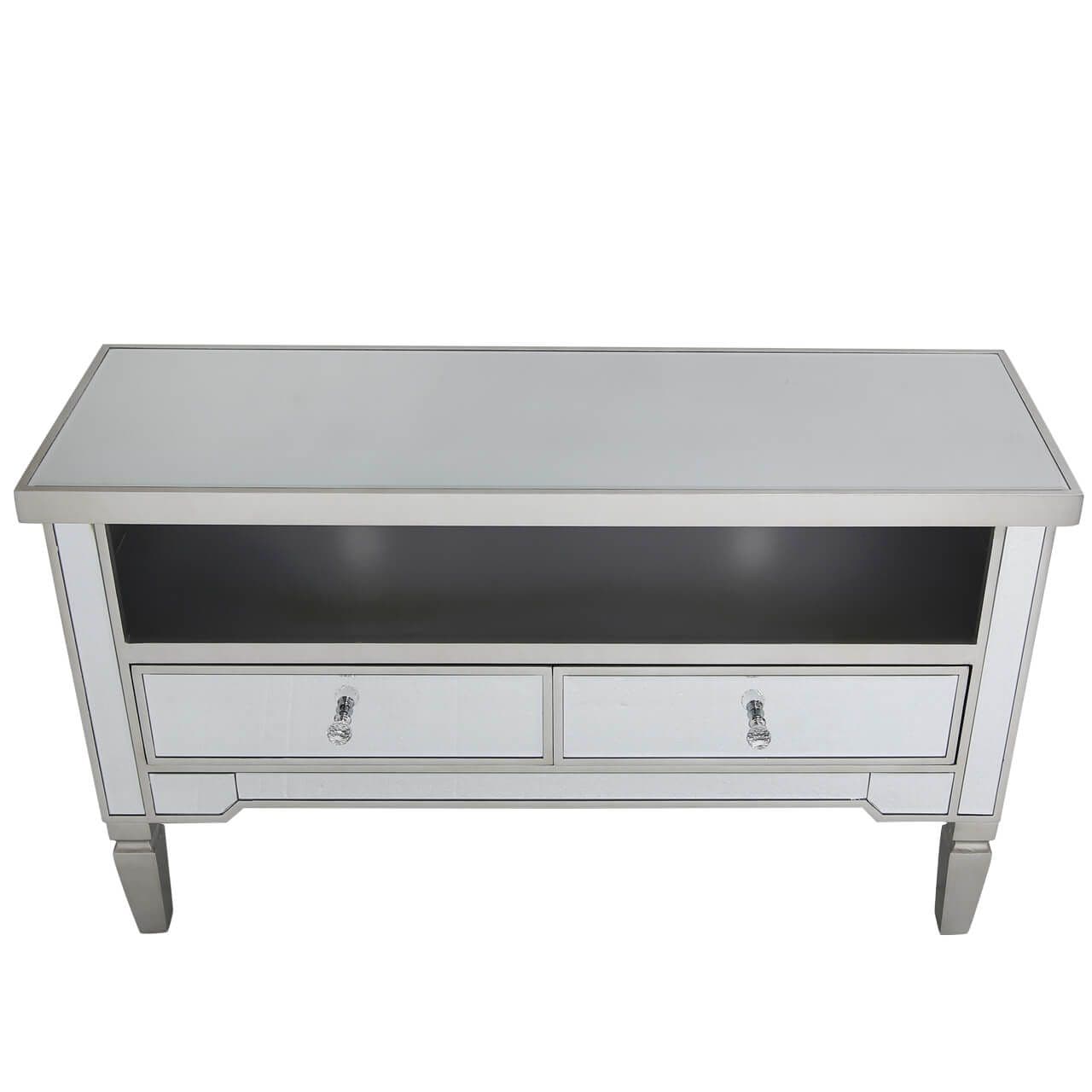 Refine your bedroom or living area with this glamorous Richmond entertainment unit. Complete with a classy mirror table top, luxury crystal shaped handles for a touch of elegance and a beautiful champagne trimming finish, fit for a high end product, not to mention 2 drawer compartments to store any appropriate household items