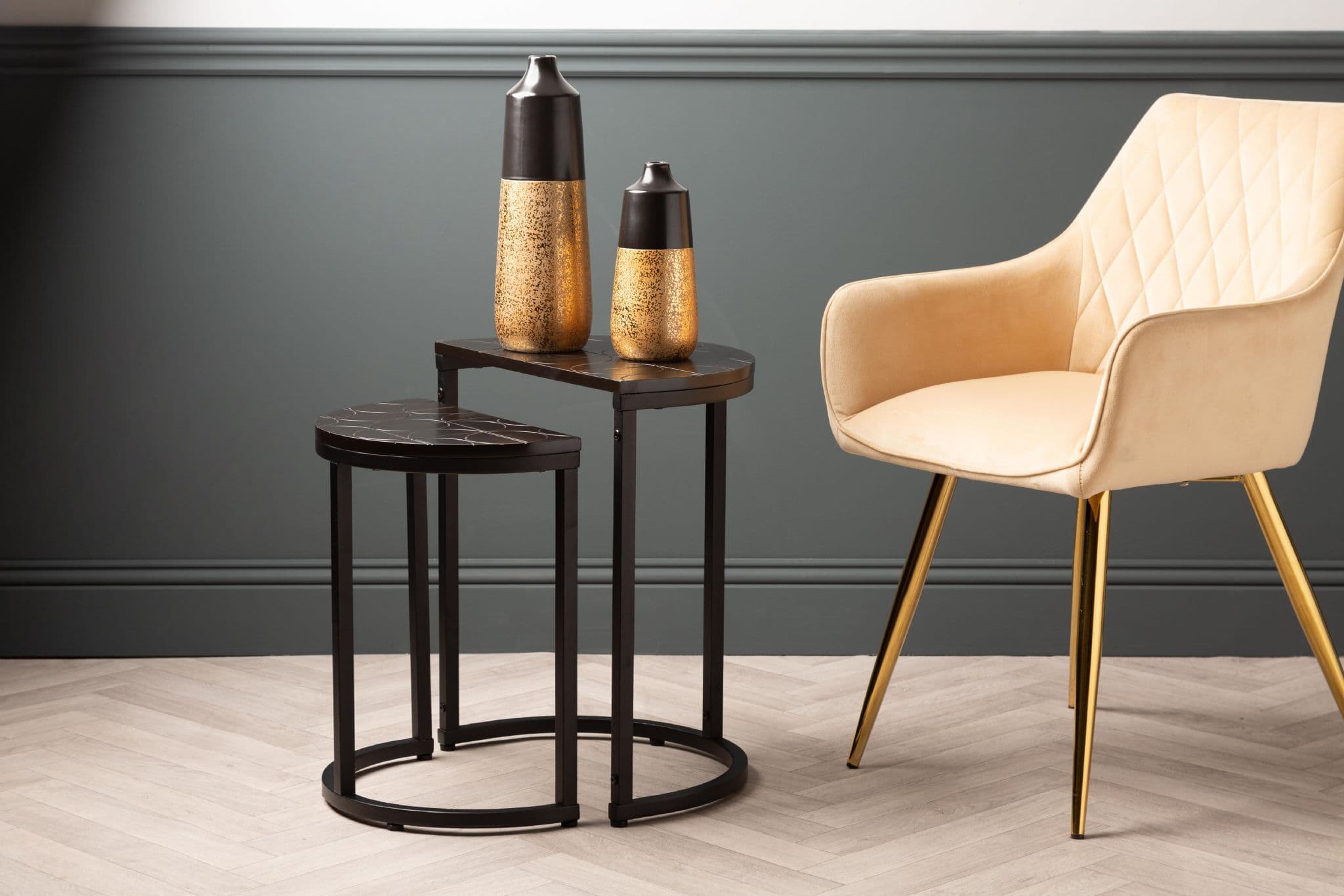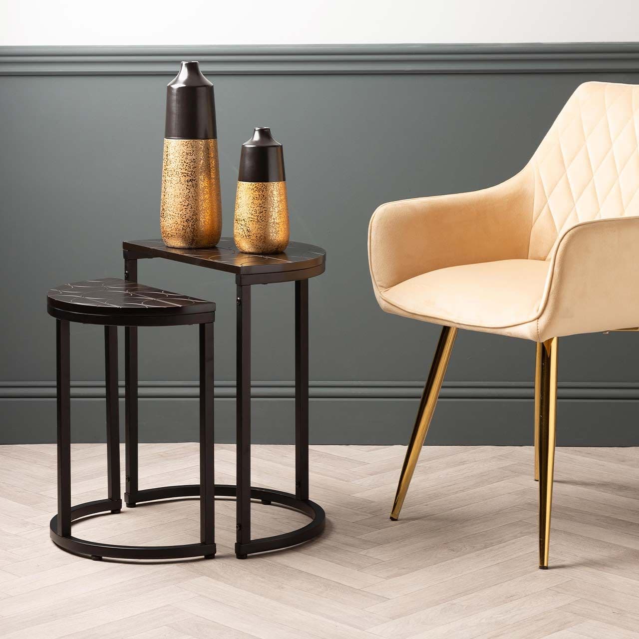 Home / Occasional Furniture View more images Product Description Embrace an on-trend flare of black into your modern interior with this versatile Solenn nest of two tables, fitting together effortlessly into any interior’s colour palette. Featuring half-moon black wooden tabletops, complemented with an elegant geometrical semicircle design and constructed upon a refined black metal base Features: Solenn Nest Tables Half Moon Wooden Tabletops Geometrical Design Refined Black Metal Base H55 X W46 X D30cm Specifications Size H55 X W46 X D30cm Colour Black Material Steel, MDF Wood Brand Home Luxe Product Code MF340-02-BL Weight 5.9kg Customer reviews No reviews left yet Write A Review Sort byMost RecentTop Rated Description Embrace an on-trend flare of black into your modern interior with this versatile Solenn nest of two tables, fitting together effortlessly into any interior’s colour palette. Featuring half-moon black wooden tabletops, complemented with an elegant geometrical semicircle design and constructed upon a refined black metal base Features: Solenn Nest Tables Half Moon Wooden Tabletops Geometrical Design Refined Black Metal Base H55 X W46 X D30cm Reviews No reviews left yet Write A Review Sort byMost RecentTop Rated Attributes Size H55 X W46 X D30cm Colour Black Material Steel, MDF Wood Brand Home Luxe Product Code MF340-02-BL Weight 5.9kg Delivery & Returns Delivery is free for all orders over £100 for a standard item in UK. All furniture & fragile items delivery charges depend on the items you purchase which can be calculated at the checkout. Once your product has shipped, it usually takes 2 to 3 business days in UK for delivery. You can return any item to us for a full refund less any delivery charges within 28 days of purchase. Please retain all original packaging and boxes. Customer Reviews Set of 2 Solenn Design Half Moon Black Nest Table Out of stock Product Code MF340-02-BL RRP: £169.99 £69.95 Out Of Stock? Visit Our Retail Showroom Clearance Prices Login to add this product to your wishlist. You may also like Item in Stock Set of 2 Solenn Design Black End Table 0 review(s) Add to cart Quickview Item in Stock Solenn Design Black Coffee Table 0 review(s) Add to cart Quickview Item in Stock Solenn Design Black Console Table 0 review(s) Add to cart Quickview Item in Stock Solenn Design Black End Table 0 review(s) Add to cart Quickview Trustpilot COLLECT FROM STORE AND GET UP TO 40% DISCOUNT Collection Available From Our London Showroom With many customers wishing to view our products in our London showroom, we're now offering our customer a HUGE 40% OFF THE ORDER when you collect. (T's & C's Apply) More Details